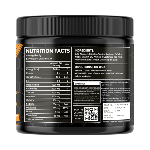 • Fruity Sensation in Orange Flavour: India’s first pre-workout that refreshes you with every sip.